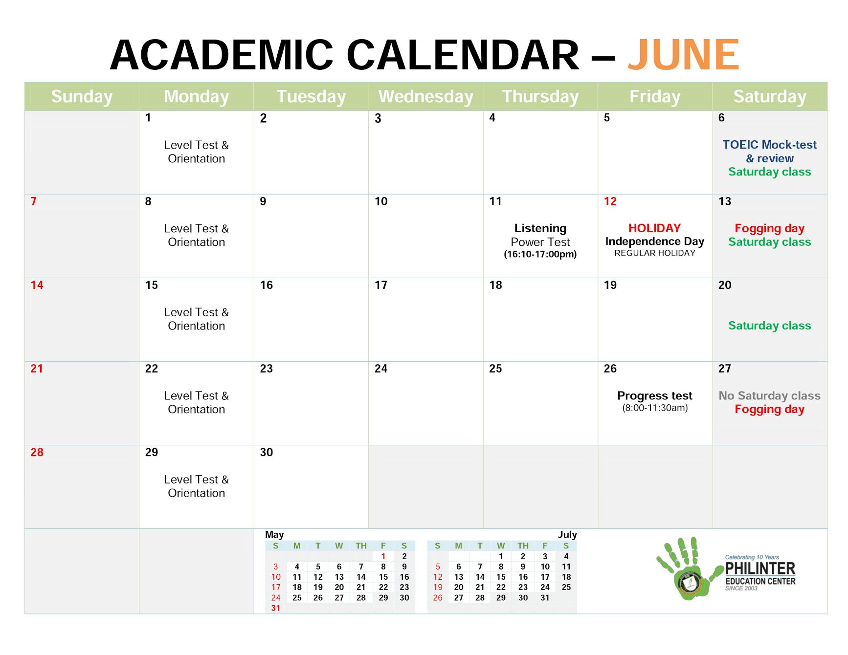 1. Lịch học tháng 6: tháng 6 có 1 ngày lễ là Ngày Quốc khánh Philippines 12/6 và như thường lệ các lớp vẫn được khai giảng vào thứ 2 hằng tuần. Kiểm tra khả năng 11/6 và kiểm tra quá trình vào 26/6. Thi thử TOEIC sẽ vào ngày 6/6.