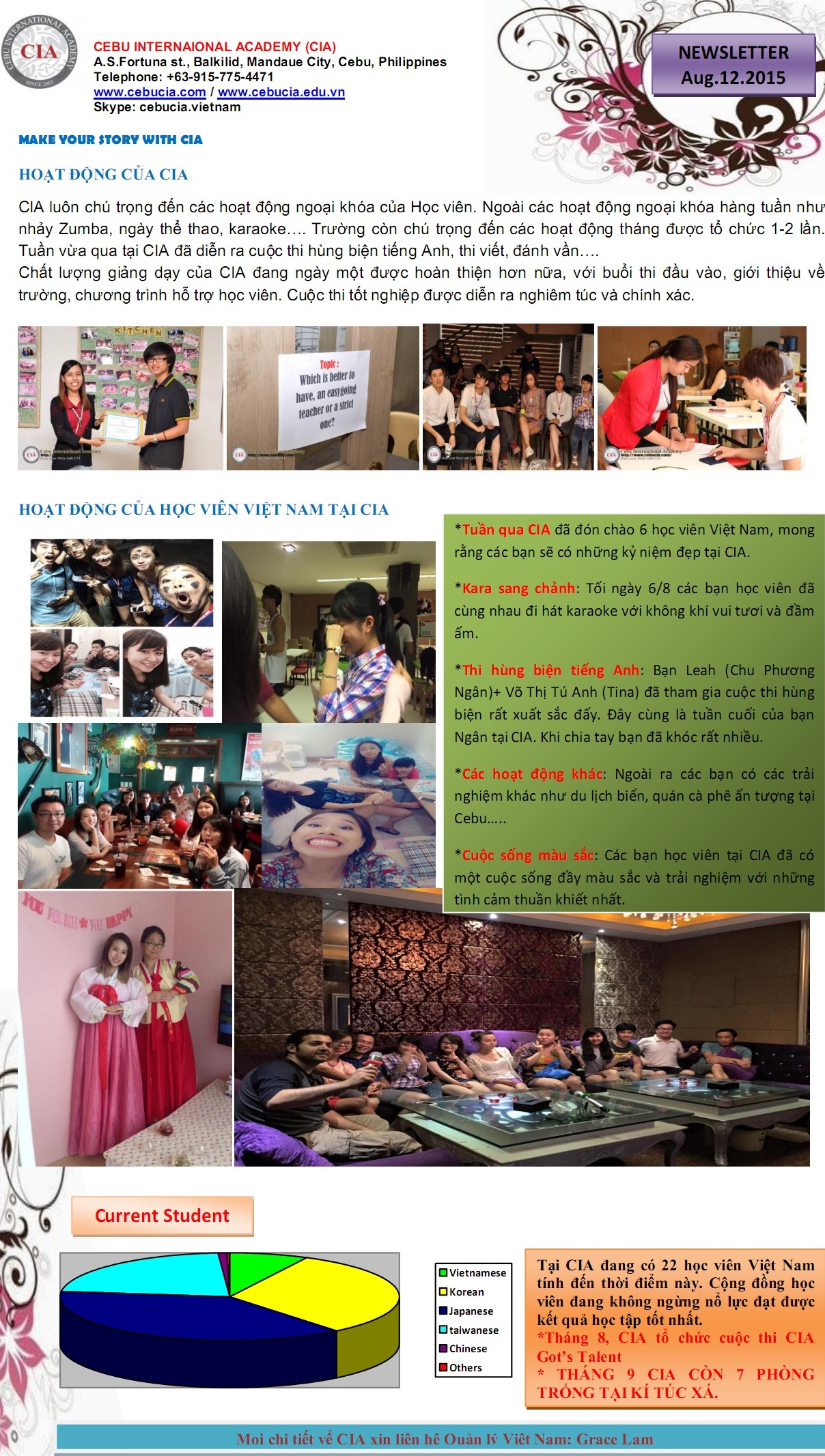 Tuần qua, CIA đã đón chào 6 học viên Việt Nam, mong rằng các bạn sẽ có những kỷ niệm đẹp tại trường. Hiện tại, CIA đang có 22 học viên Việt Nam đang theo học tiếng Anh. Cộng đồng học viên Việt Nam này đang không ngừng nổ lực học để đạt được kết quả tốt nhất.