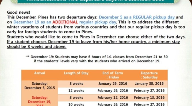 Như vậy thêm vào đó, Pines nhận học viên hàng tuần, nhưng chỉ tổ chức đón học viên tại sân bay Manila hàng tháng vào ngày cố định trong năm 2015 như sau: 12/9, 10/10, 7/11, 5/12 và 19/12.