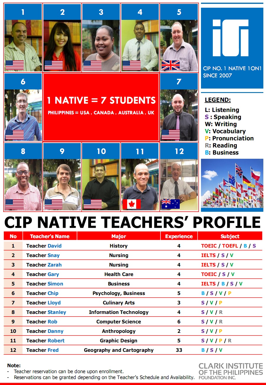 Tại Trường CIP, với quy mô khoảng 100 học viên đến từ các nước không sử dụng tiếng Anh làm ngôn ngữ chính như Hàn Quốc, Nhật Bản, Đài Loan, Việt Nam, Trung Quốc, Hong Kong, Thái Lan, các quốc gia vùng Trung Đông… và CIP sở hữu đội ngũ giáo viên bản ngữ hùng hậu nhất so với các trường đào tạo tiếng Anh khác tại Philippines.