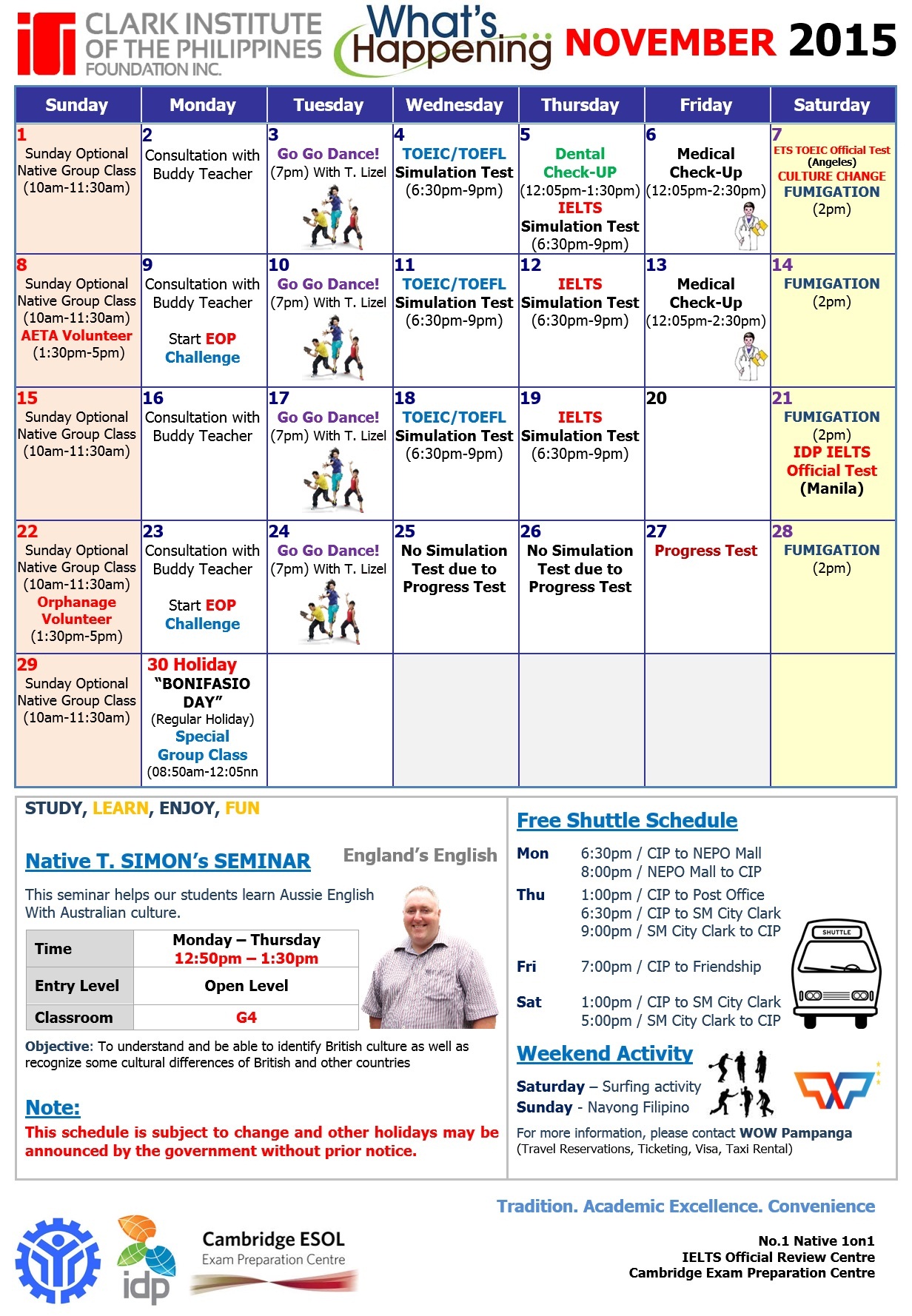 1. CIP November 2015 Calendar: Trường Anh ngữ CIP cung cấp nhiều và đa dạng các hoạt động học thuật và hoạt động ngoại khóa cho học viên, được lên kế hoạch chi tiết, cụ thể và bải bản nhằm mang lại sự thích thú cho người học khi ở tại trường. Trong tháng 11 sắp đến, CIP tổ chức nhiều hoạt động như Go Go Dance, Kiểm tra sức khỏe định kỳ cho học viên, Thi chính thức TOEIC, IELTS chính thức, thi thử và thi kiểm tra tiến bộ… Mời các bạn xem bên dưới nhé!