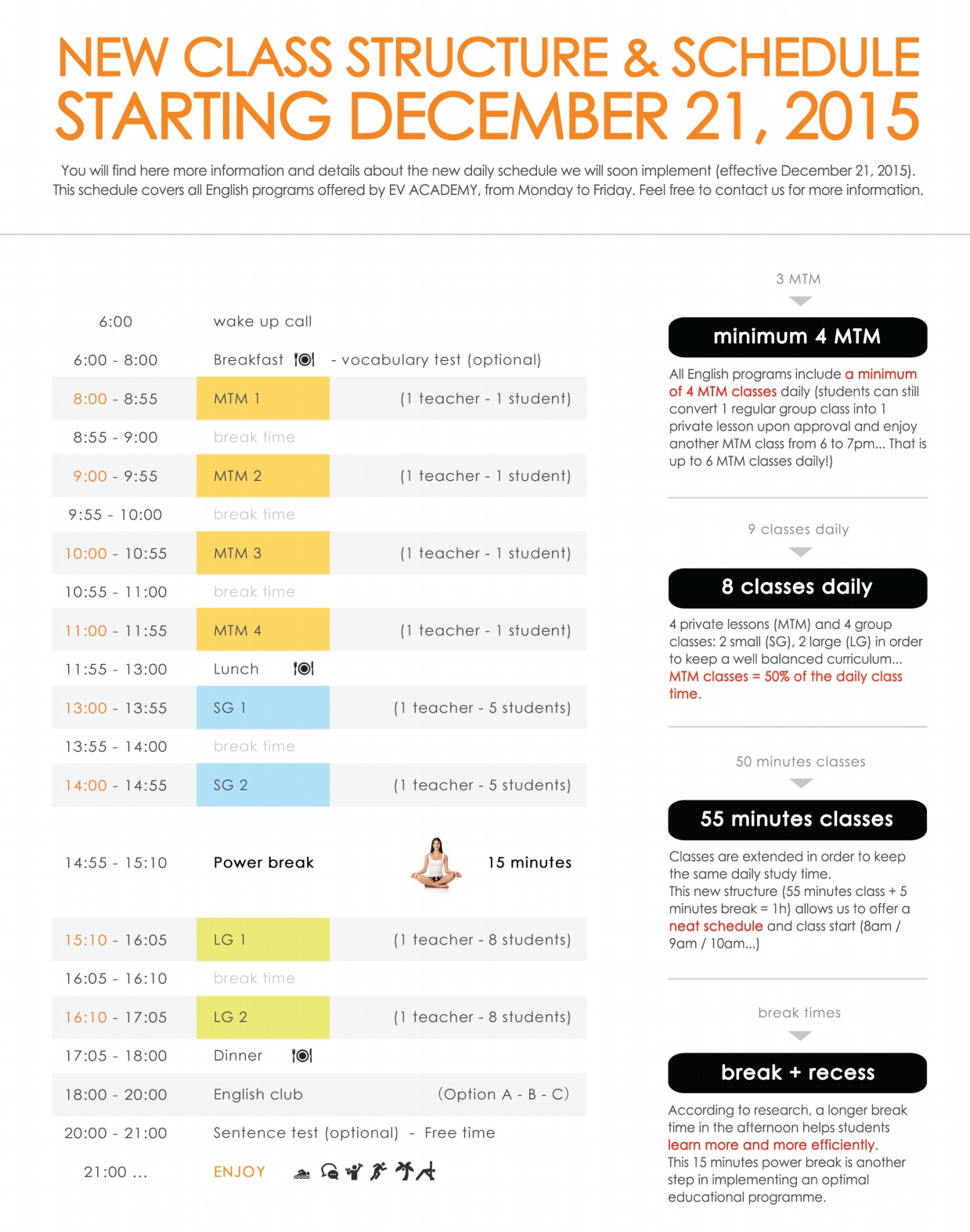 Nhằm nâng cao hơn nữa chất lượng đào tạo và đáp ứng nhu cầu học ngày càng cao của học viên, Trường Anh ngữ EV tại thành phố Cebu, Philippines đã lên kế hoạch thay đổi cấu trúc lớp học và sắp xếp lại thời khóa biểu hàng ngày. Những thay đổi này sẽ được chính thức áp dụng và đi vào thực tiễn vào ngày 21/12/2015. Cụ thể như sau: