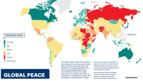 Theo một nghiên cứu về chỉ số hòa bình toàn cầu là thước đo của sự yên bình tương đối của 163 quốc gia trên toàn thế giới (đại diện cho hơn 99.7% dân số thế giới) thì Philippines đứng thứ 134 trong số 162 quốc gia (năm 2016). Philippines dù thứ hạng khá thấp nhưng lại nằm trong khoảng màu vàng, cũng đồng nghĩa rằng tình hình chính trị, hòa bình ở xứ vạn đảo chưa đến mức tồi tệ như nhiều người tưởng. Ngoài một số khu vực nguy hiểm đã được cảnh báo và bảo vệ thì những nơi còn lại đều an toàn như những nơi khác trong khu vực Đông Nam Á.