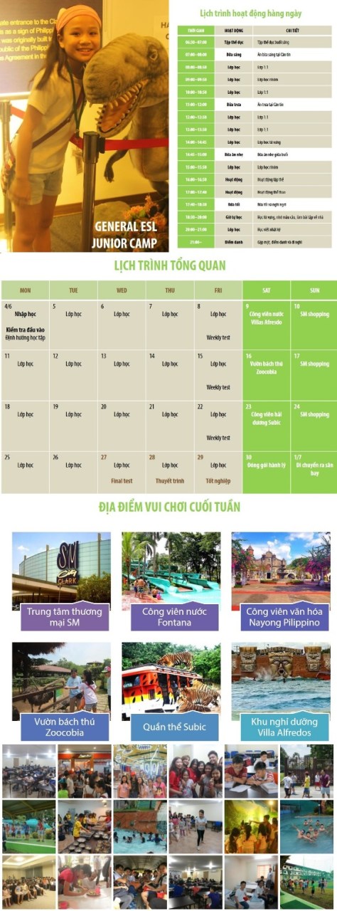 Hàng ngày, học viên sẽ có 4 lớp học 1:1 tập trung vào 4 kỹ năng chính (Nghe, Nói, Đọc, Viết) và 2 lớp học nhóm 1:4 để vận dụng các kỹ năng Tiếng Anh đã học dựa trên các hoạt động trong lớp. Bên cạnh đó, học viên có thêm các hoạt động nhóm lớn: Chơi thể thao, Học hát – nhảy, Thuyết trình, Các trò chơi tập thể… và các giờ tự học buổi tối (có hỗ trợ từ giáo viên) để tăng cường, bổ trợ thêm kiến thức. Mỗi buổi sáng, học viên sẽ bắt đầu ngày học với lớp Morning Reading Class (rèn luyện kỹ năng đọc và nghe). Vào thứ 6 mỗi tuần học, học viên sẽ có bài kiểm tra đánh giá năng lực và phiếu đánh giá kết quả học tập từ thầy cô giáo. Cuối mỗi tuần, chương trình sẽ tổ chức cho học viên các hoạt động ngoài trời: Thăm quan công viên hải dương, Vui chơi tại công viên nước, Khám phá vườn bách thú… để giải trí và có những trải nghiệm quốc tế tại Philippines.