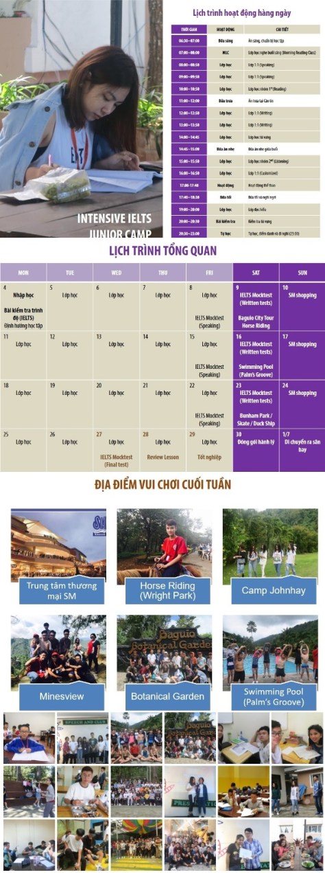 Hàng ngày, học viên sẽ có 4 lớp học 1:1 tập trung vào 2 kỹ năng chính (Nói, Viết) và 2 lớp học nhóm 1:4 học tập cách làm bài IELTS Reading, Listening. Bên cạnh đó, học viên có thêm các hoạt động nhóm lớn: Chơi thể thao, Học hát – nhảy, Thuyết trình, Các trò chơi tập thể… và các giờ tự học buổi tối (có hỗ trợ từ giáo viên) để tăng cường, bổ trợ thêm kiến thức IELTS. Mỗi buổi sáng, học viên sẽ bắt đầu ngày học với lớp Morning Reading Class (rèn luyện kỹ năng đọc và nghe). Vào thứ 7 mỗi tuần học, học viên sẽ có bài thi thử mocktest IELTS và phiếu đánh giá kết quả học tập từ thầy cô giáo. Cuối mỗi tuần, chương trình sẽ tổ chức cho học viên các hoạt động ngoài trời: Thăm quan công viên hải dương, Vui chơi tại công viên nước, Khám phá vườn bách thú… để giải trí và có những trải nghiệm quốc tế tại Philippines.
