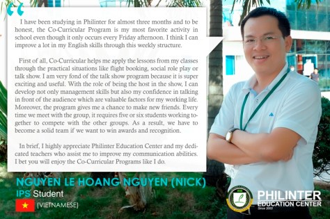 “Tôi đã học tại Philinter Education Center trong 3 tháng, và thực sự thì Chương trình học ứng dụng Co-Curricular Program là chương trình mà tôi thích nhất tại Philinter, mặc dù chương trình này chỉ được tổ chức vào chiều thứ 6 hàng tuần Tôi nghĩ mình có thể cải thiện đáng kể khả năng Tiếng Anh của mình với chương trình học hàng tuần như vậy.
