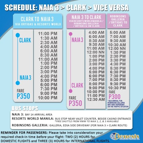 Sau khi ra ngoài sân bay theo các lối thoát (Exit gate) hoặc di chuyển từ Terminal 2 sang Terminal 3 xong, học viên di chuyển đến BAY 14. Tại BAY 14, hãng xe Genesis cung cấp tuyến xe khách chất lượng cao chạy từ Sân bay Manila – Terminal 3 đến Sân bay Quốc tế Clark (thành phố Clark) và Trung tâm thương mại SM Clark.