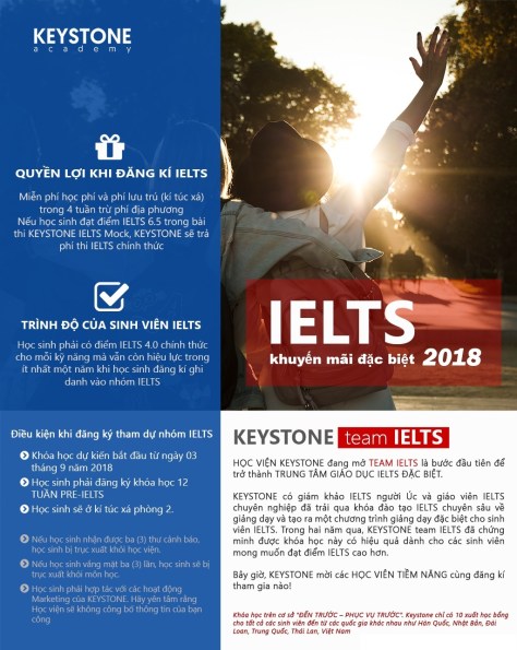 - Nếu học viên đạt điểm IELTS 6.5 trong bài thi Keystone IELTS Mock Test, Keystone sẽ trả phí thi IELTS chính thức trị giá tương đương 210 USD.