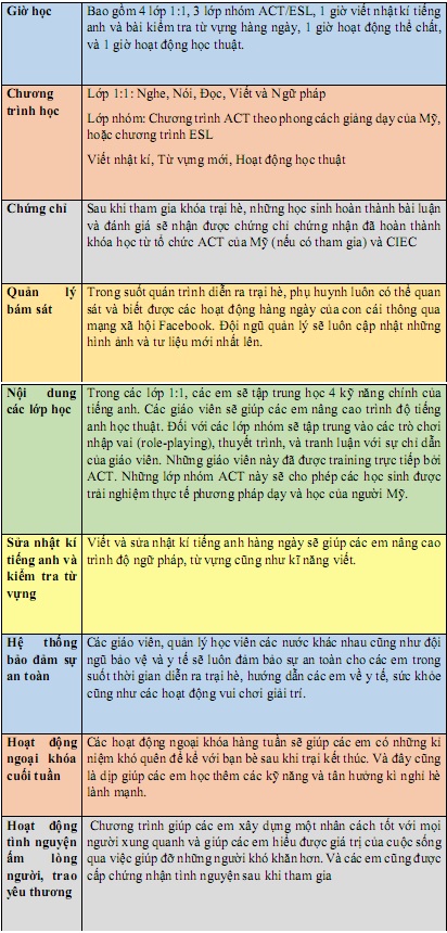 - Môi trường trại hè quốc tế với nhiều học sinh đến từ các quốc gia khác nhau.