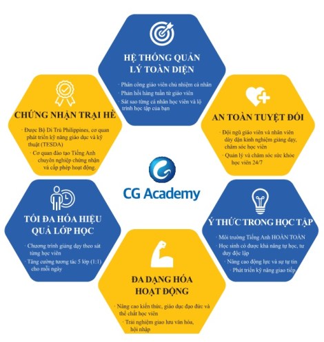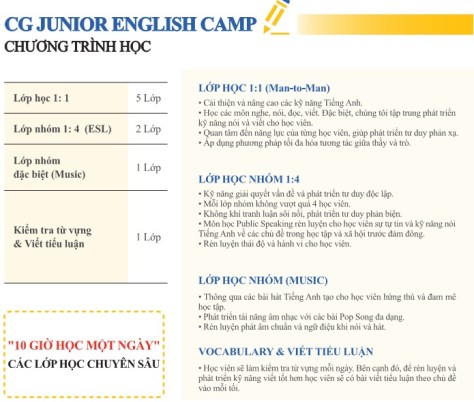 “Trại hè tiếng Anh trường CG, chương trình trại hè đào tạo chuyên sâu trong thời gian ngắn, quản lý nghiêm ngặt và an toàn. Với bề dày 14 năm kinh nghiệm chúng tôi tự tin chương trình trại hè này sẽ đem lại hiệu quả học tập tốt nhất cho học viên”.