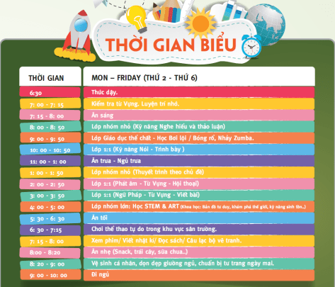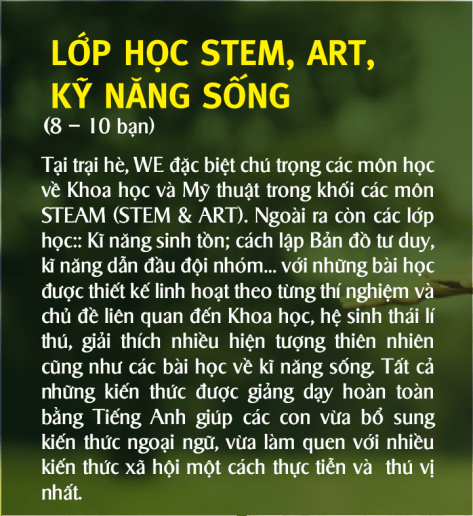 Được học lớp kỹ năng sống, trường đặc biệt chú trọng vào các môn khoa học và mỹ thuật. Ngoài ra, còn có các lớp học kỹ năng sinh tồn, cách lập bản đồ tư duy, kỹ năng dẫn đầu đội nhóm,…