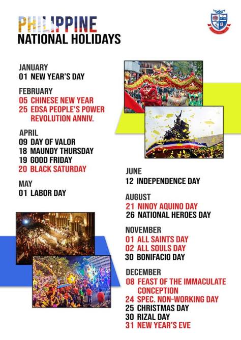 Du học tiếng Anh ở Philippines đã không còn quá xa lạ đối với du học sinh Việt Nam. Đến thời điểm này chắc hẳn đã có nhiều bậc Phụ huynh, học sinh đã có kế hoạch học tập, làm việc cho mình rồi, nhưng nếu có kế hoạch du học tiếng Anh ở Philippines năm 2019 thì đừng bỏ lỡ lịch nghỉ lễ tại đất nước này nhé.