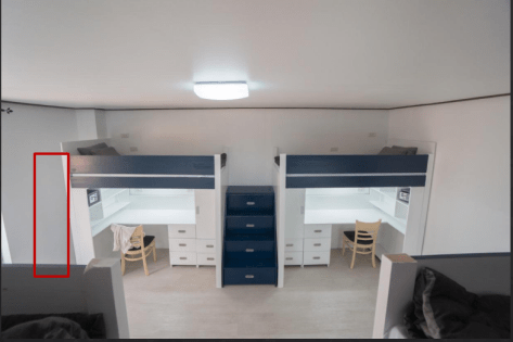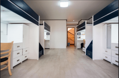 Trường cải tạo giường đơn thành giường tầng. Dưới mỗi giường là bàn, tủ sách, tủ vải và không gian lưu trữ. Tầng thứ hai là nơi giường nằm. Điểm cần xem xét ở đây là có rất nhiều không gian lưu trữ cho mỗi cá nhân (tất cả không gian bên cạnh bàn là không gian lưu trữ). Khu vực màu đỏ là không gian nơi học viên có thể lưu trữ vali, bàn học rộng rãi hơn, học viên không cần phải đặt nhiều đồ trên bàn. Phần màu vàng được thiết kế để kết nối ổ cắm, học viên có thể sắp xếp thiết bị điện như sạc điện thoại di động hoặc máy tính xách tay trên bàn.