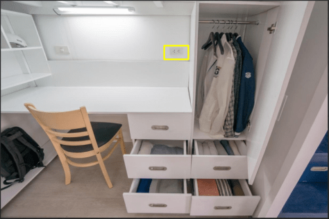 Để sử dụng máy cạo râu và máy sấy trong bồn rửa, một ổ cắm đã được thêm vào phần màu vàng. Để học viên bảo quản trái cây, thức uống được tốt nhất trường cũng trang bị thêm tủ lạnh..
