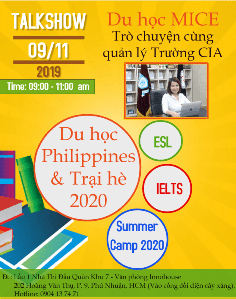 Bạn đang phân vân không biết bắt đầu học tiếng Anh từ đâu, học theo phương pháp nào, bạn học nhiều năm nhưng không thể giao tiếp được. Bạn mong muốn tìm một tia sáng cho việc học tiếng Anh của mình thì chương trình Talkshow tại Du học MICE là nơi dành cho bạn. Chương trình với chủ đề: “Du học Philippines & Trại hè 2020″ Học tiếng Anh cấp tốc tại các trường Anh ngữ hàng đầu với sự tham dự của đại diện quản lý cấp cao của trường CIA.