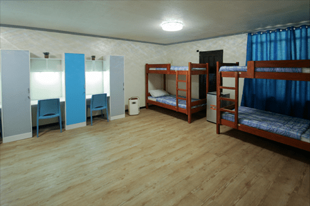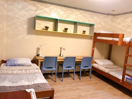 Bàn học trong phòng được thiết kế rất riêng tư, mỗi bạn sẽ có 1 ngăn riêng với chiết tủ cá nhân.