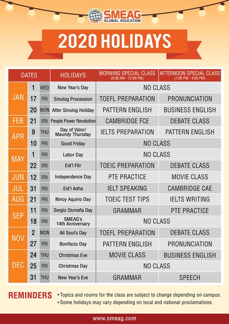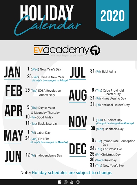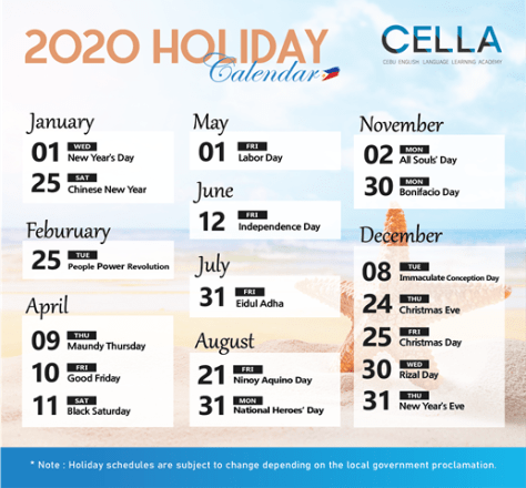 Cập nhật lịch nghỉ lễ trước khi đăng ký học tiếng Anh ở Philippines là điều vô cùng cần thiết đối với học viên Việt Nam. Du học tiếng Anh tại Philippines đã không còn quá xa lạ. Vì vậy, đến thời điểm này chắc hẳn đã có nhiều bậc Phụ huynh, học sinh đã có kế hoạch du học tiếng Anh ở Philippines năm 2020. Hãy nhanh tay cập nhật lịch nghỉ lễ của các trường Anh ngữ tại Philippines năm2020 nhé.