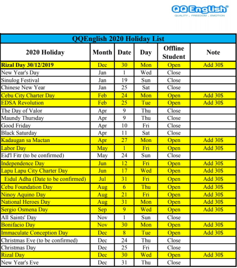 - Tại Trường QQ một số ngày lễ bắt buộc học viên phải tham gia học và đóng thêm phí 30$/ngày lễ (Phần được tô màu vàng)