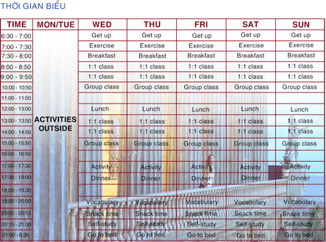 Với chương trình lớp học tiếng Anh 8 lớp mỗi ngày gồm 4 lớp 1:1 (nghe, nói, đọc, viết, ngữ pháp, từ vựng) + 2 lớp học nhóm phản xạ, thảo luận + 1 lớp tự học để ôn luyện bài học và 1 lớp hoạt động thể chất sẽ giúp các em phát triển đầy đủ về thể chất và tinh thần.
