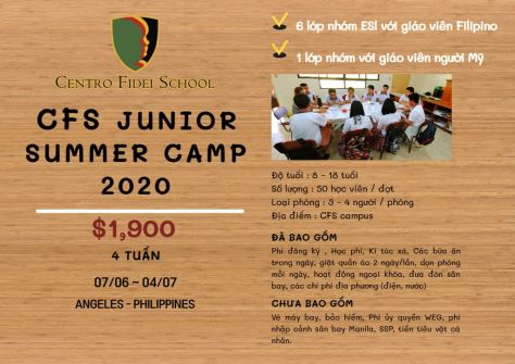 Chương trình du học trại hè tiếng Anh 2020 Trường CFS được thiết kế với mục đích giúp các em học sinh Việt Nam có những trải nghiệm và học tập tại trường quốc tế ở Philippines với học sinh quốc tế, dành cho các bé độ tuổi từ 8 đến 18 tuổi tại Angeles City – Philippines. Học tập và trải nghiệm môi trường học tập quốc tế trước khi chính thức du học sang Mỹ, Anh, Úc, Canada…