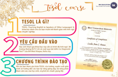 Khóa học dành cho đối tượng muốn trở thành giáo viên tiếng Anh chuyên nghiệp, các bạn mang quốc tịch ở những nước mà ngôn ngữ chính không phải là Anh ngữ. Khi các bạn tham gia khóa Tesol của MK, xuyên suốt giáo trình sẽ hướng dẫn các bạn kỹ năng giảng dạy. Học viên tham gia khóa học này cần có trình độ Anh ngữ 3B trở lên (kết quả sau bài kiểm tra đầu vào bao gồm tất cả các kỹ năng).