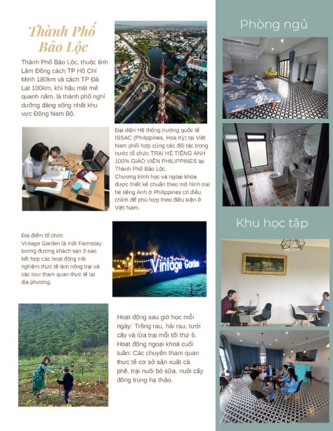 Với 100% giáo viên Philippines giàu kinh nghiệm trựcc tiếp giảng dạy tất cả các lớp tiếng Anh.Học liên tục từ thứ Hai đến thứ Sáu với 5 lớp học nhóm nhỏ (6-8 học sinh/ lớp) + 2 giờ tự học có hỗ trợ của giáo viên buổi tối trong môi trường khuyến khích sử dụng tiếng Anh trong sinh hoạt trải nghiệm tại Vintage Garden Farmstay và trong các hành trình du lịch, khám phá Bảo Lộc.