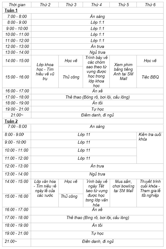 | Giáo viên | 5 giáo viên bản ngữ (Anh, Úc, Mỹ, Canada), 45 giáo viên Filipino |