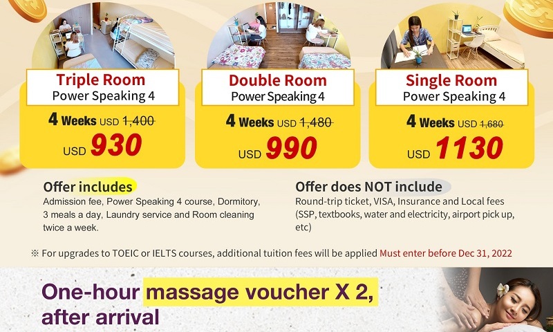 930 USD/ 4 tuần học Power Speaking ESL+ KTX phòng 3 (giá gốc 1.350 USD)