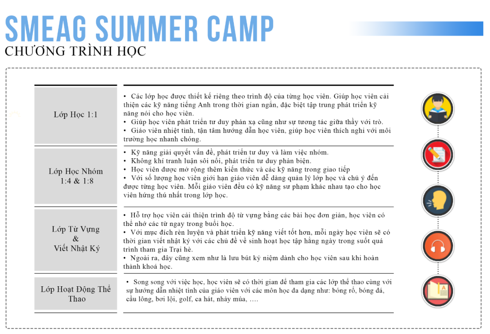 Quay trở lại sau 3 năm ảnh hưởng của đại dịch Covid, trại hè tiếng Anh 2023 của SMEAG sẽ tiếp tục mang đến cơ hội trải nghiệm môi trường học tập đa văn hóa, sinh hoạt và học tập cùng học sinh quốc tế giúp học viên tăng cường kỹ năng giao tiếp, tự tin thể hiện cá tính, tài năng. Với đội ngũ giáo viên nhiệt tình, giàu kinh nghiệm, hệ thống quản lý đa quốc gia chuyên nghiệp.