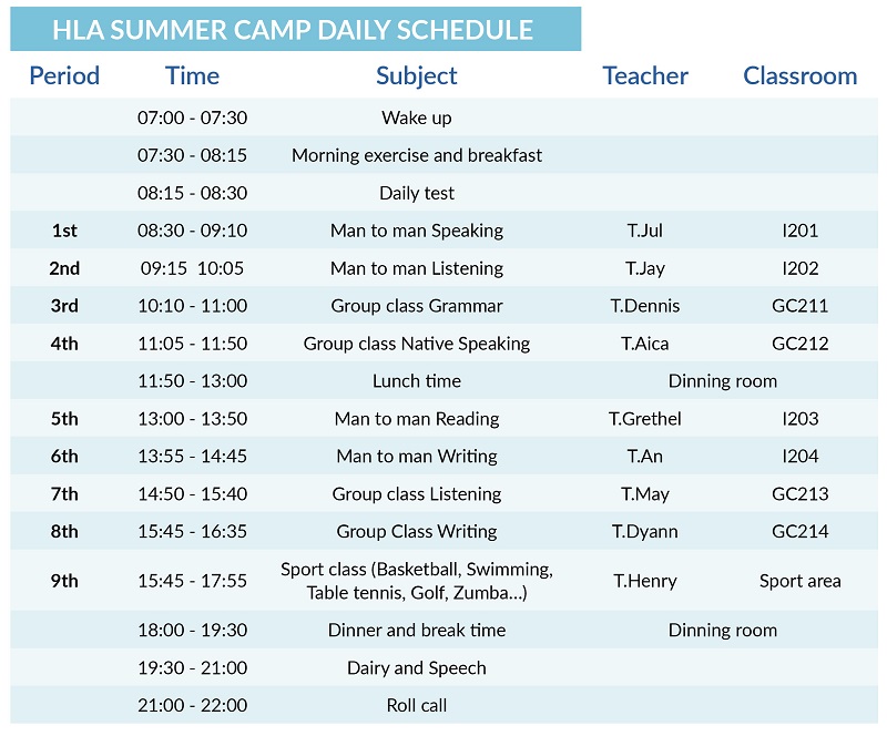 Chương trình trại hè của HLA được thiết kế cho các bé từ 6 – 16 tuổi. Với lịch trình linh hoạt 4 – 6 – 8 tuần mà phụ huynh có thể lựa chọn thời gian học thích hợp cho bé.