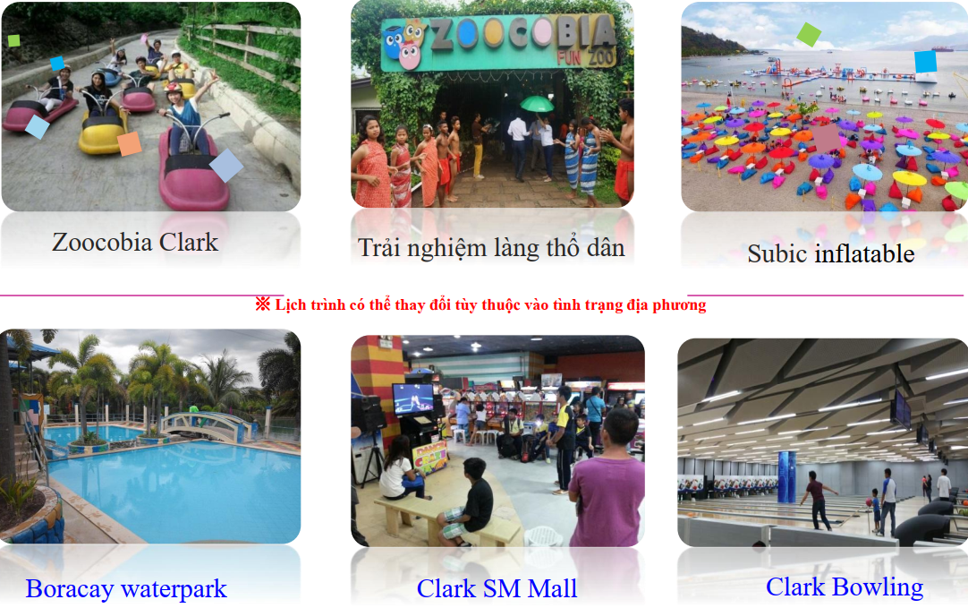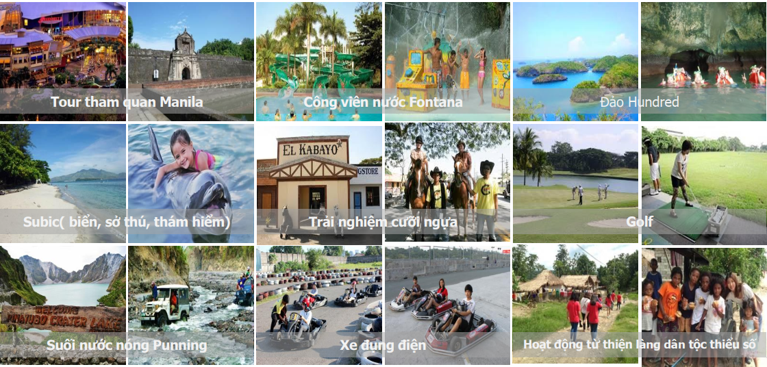 Cuối tuần các bé sẽ được tham gia các hoat động, du lịch như: Vui chơi tại Fontana Water Park, Villa Alfredos, Subic Ocean Park, bơi lội, chơi Bowling, Golf, Shopping tại SM Mall, cưỡi ngựa, chèo thuyền,…