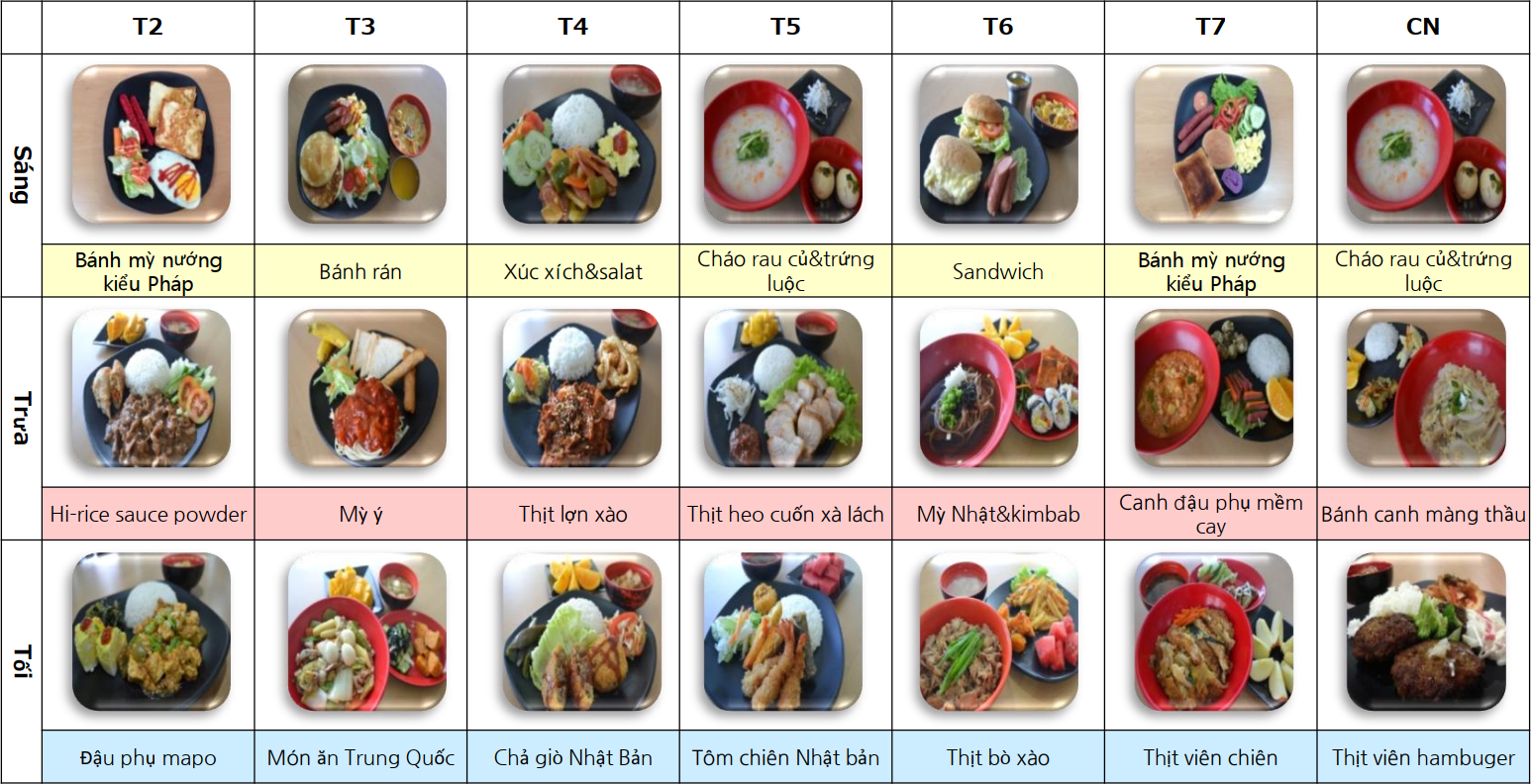 - Bữa ăn được thiết kế đầy đủ chất dinh dưỡng và phù hợp với khẩu vị các bé Việt Nam. Cung cấp trái cây tươi cho mỗi bữa ăn và cung cấp thực đơn khác nhau mỗi ngày trong 4 tuần. Để ngăn ngộ độc thực phẩm, thịt được nấu chín và tất cả rau/ quả đều được rửa bằng nước khoán.