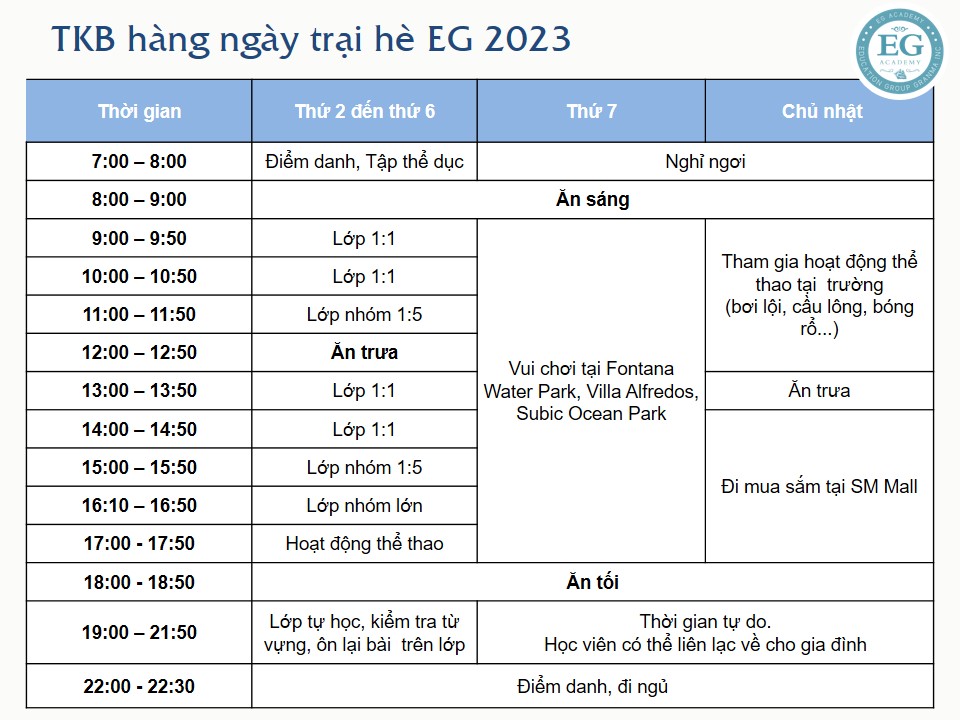 Lịch trình, học phí trọn gói trại hè tiếng Anh EG 2023