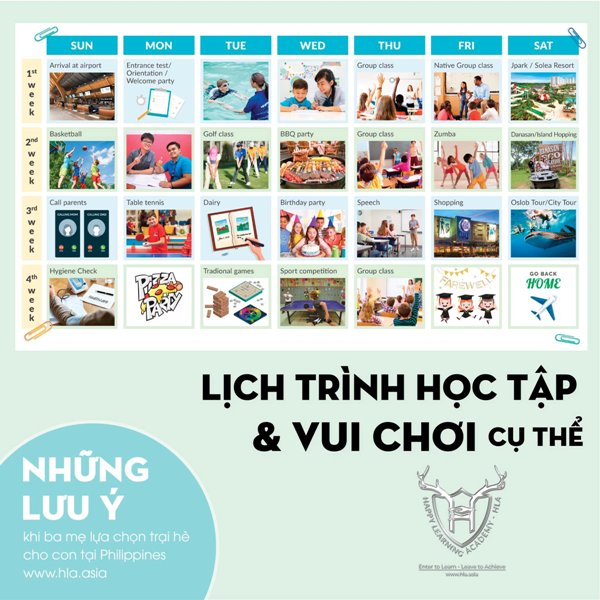 Để chuẩn bị tốt nhất mùa hè cho các con, ba mẹ đừng ngại ngùng tìm hiểu thật kĩ về lịch trình, thời gian, từng địa điểm cũng như từng hoạt động vui chơi cụ thể mà các con sẽ tham gia. Với lịch trình linh hoạt 4-6-8 tuần tại HLA mà quý phụ huynh có thể lựa chọn thời gian học thích hợp cho bé. Hàng ngày các bé sẽ được chụp hình học tập, vui chơi và cập nhật trên trang Fanpage của trường.