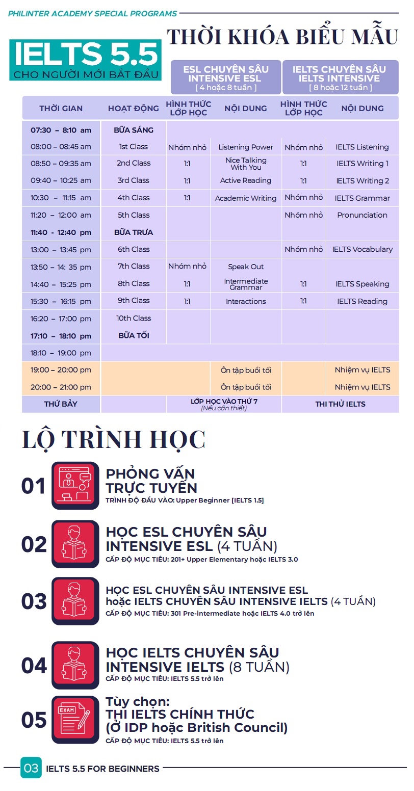 bắt đầu ở trình độ Sơ cấp với mục tiêu đạt được số điểm 5.5 IELTS.