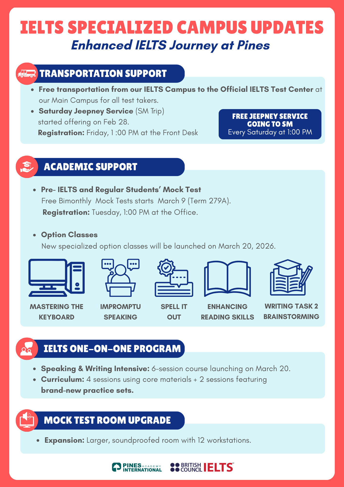 - Transportation Support: hỗ trợ đưa đón đến địa điểm thi IELTS chính thức và dịch vụ jeepney miễn phí vào thứ Bảy đến SM Mall