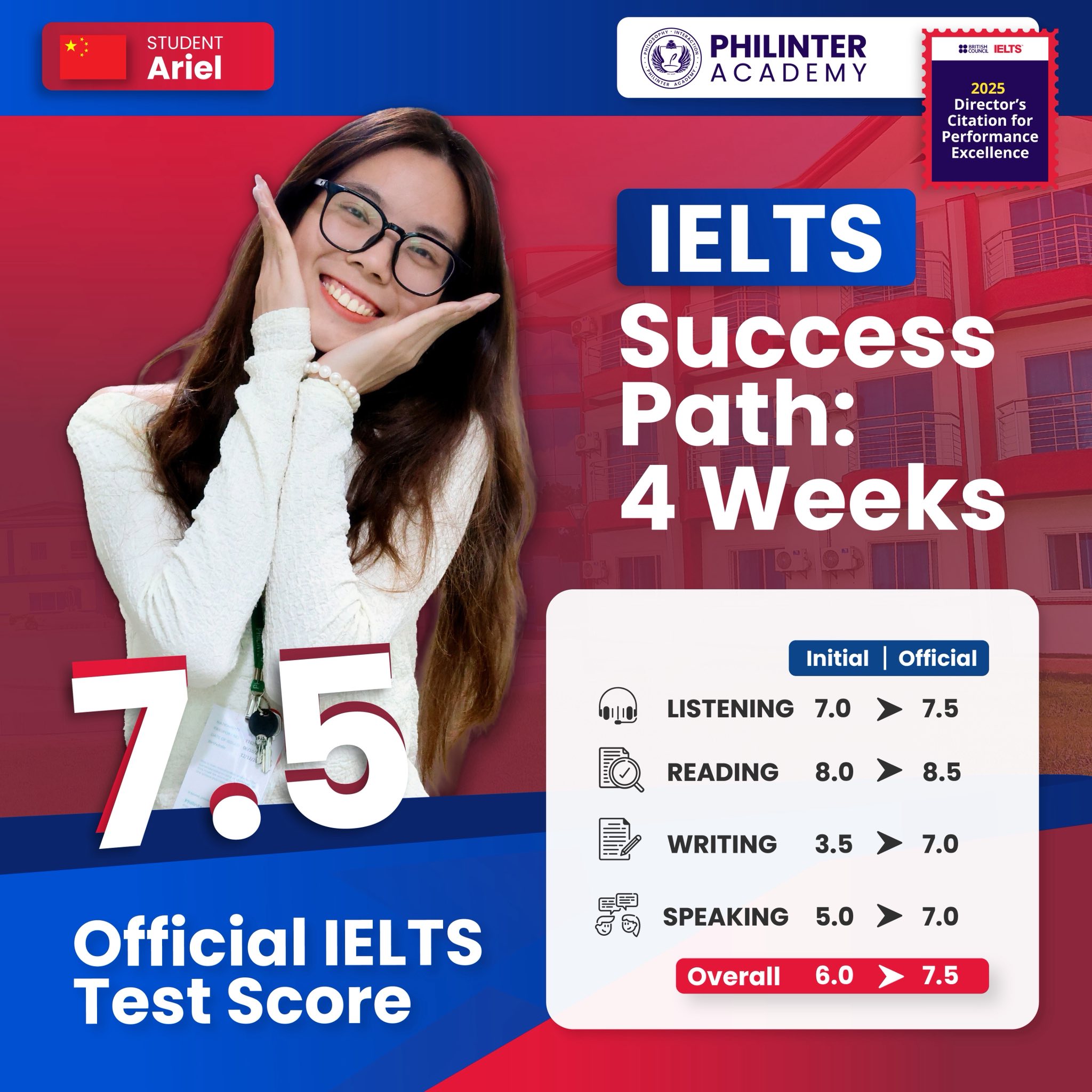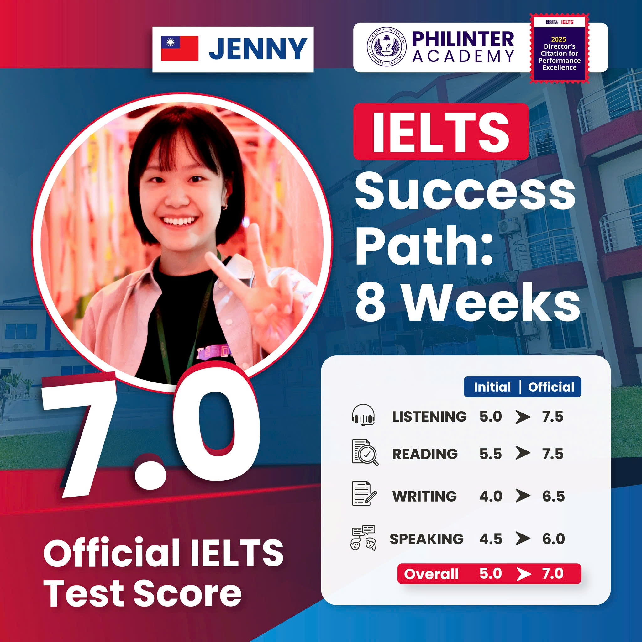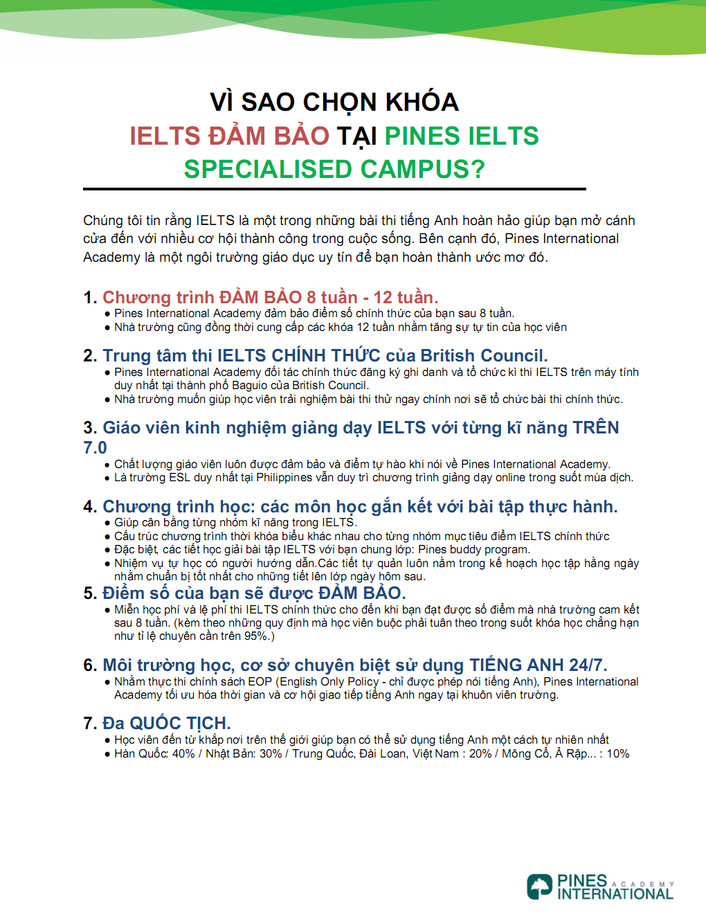 Các trường tại Philippines hiện nay đã thiết lập một tiêu chuẩn mới trong việc đào tạo tiếng Anh học thuật với khóa IELTS đảm bảo điểm trong thời gian ngắn chỉ 8 tuần – mức thời gian ngắn nhất hiện nay tại Philippines (so với thông lệ 10-12 tuần tại các trường khác), với vị thế là một môi trường học tập chuyên sâu dành riêng cho học viên trình độ trung cấp và cao cấp.