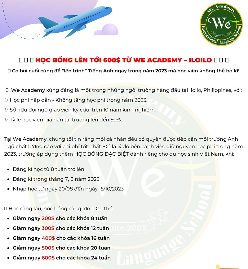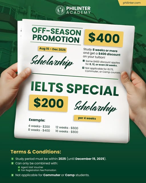 Cập nhật học bổng ưu đãi mới nhất cho đăng ký và nhập học cuối năm 2025 đến đầu 2026 từ 150 đến 350 USD/ tháng của các trường. Các bạn có kế hoạch du học tiếng Anh Philippines trong mùa tiết kiệm cuối năm 2025 này thì chọn cho mình ngay trường phù hợp nhất nhé, với ưu đãi khủng chỉ từ 18 – 25 triệu VND cho 4 tuần học. Hãy xem và đăng ký ngay kẻo lỡ.