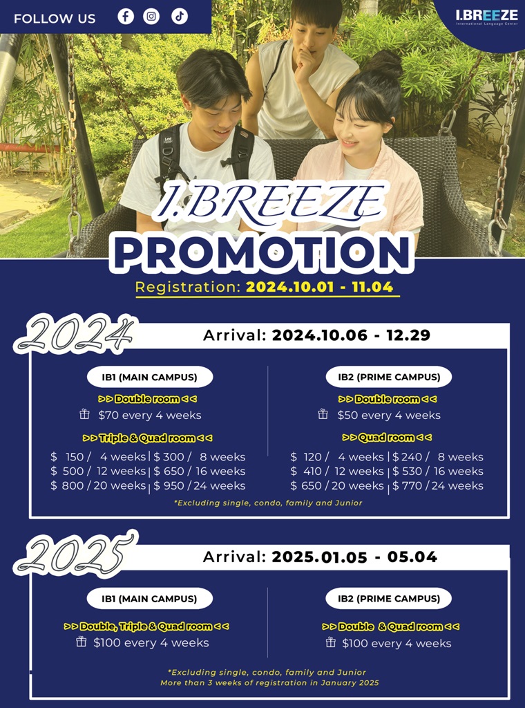 VD: khóa General ESL + phòng ở 3 người (tặng bữa ăn sáng) chỉ còn 800 USD 4 tuần