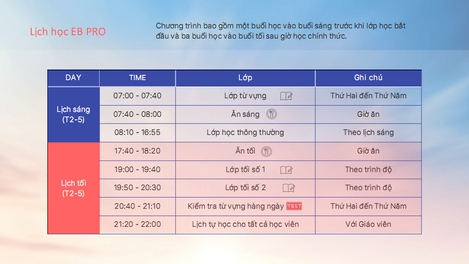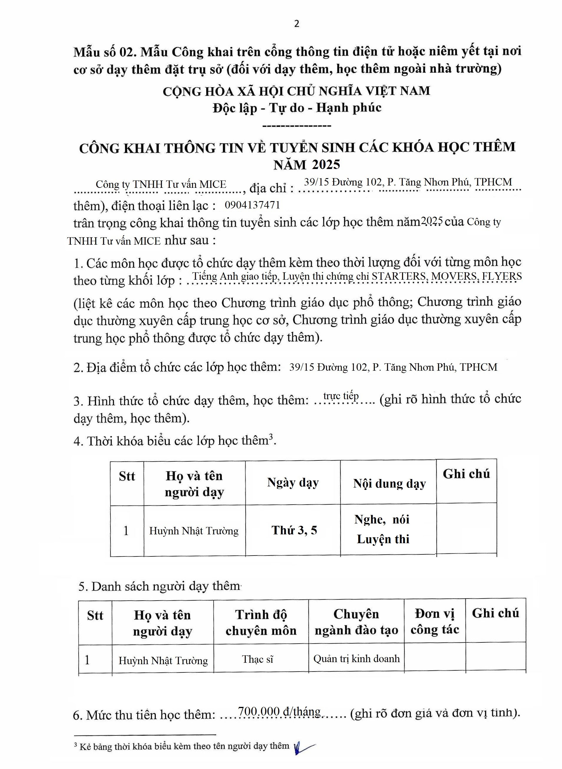 Tuần học 2 buổi hoặc theo lịch cụ thể.
