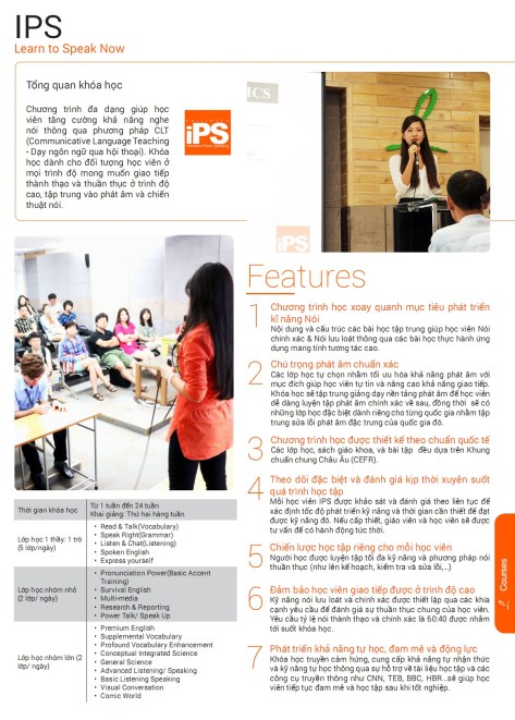 IPS (Intensive Power Speaking)/ ACE (Authentic Communicative English)/ SURVIVAL là tên gọi khác nhau của các khóa học đặc trưng cải thiện phần phát âm và nói tiếng Anh lưu loát, nâng cao từ vựng và phản xạ; từ đó phối hợp các kỹ năng để giao tiếp một cách thuần thục nhanh chóng. Đồng thời, học viên cũng có cơ hội tương tác nhiều hơn thông qua 1 lớp 1:1 tăng cường.