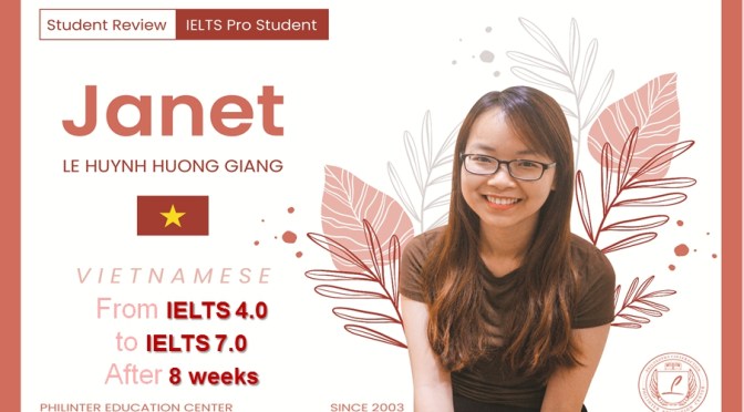 JANET là tên tiếng Anh, nhưng tên tiếng Việt em là Lê Huỳnh Hương Giang. Đến và tập tại Philinter là một trong những quyết định sáng suốt của em. Thật ra, hai tháng thì khá ngắn để học khóa IELTS. Tuy nhiên, cùng với sự giúp đỡ tận tình, đầy nhiệt huyết, và thân thiện của các giáo viên, em đã tiến bộ rất nhiều. Cuối cùng, em thật sự muốn giới thiệu các bạn đang có ý định muốn học IELTS ở Việt Nam, hãy đến với trường Philitner!