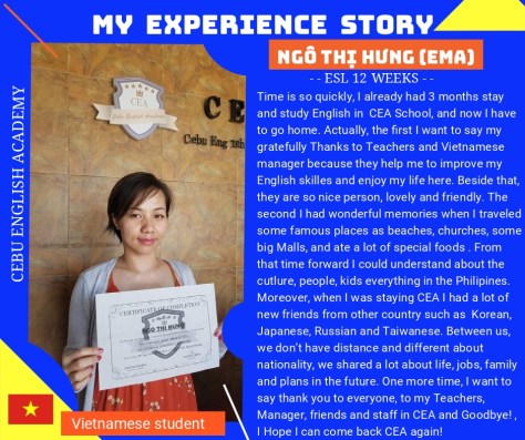 👉👉 Time is so quickly, I already had 3 months stay and study English in CEA School, and now I have to go home. Actually, the first I want to say my gratefully Thanks to Teachers and Vietnamese manager because they help me to improve my English skills and enjoy my life here. Beside that they are so nice person, lovely and friendly. The second I had wonderful memories when I traveled some famous places as beaches, churches, some big Malls, and ate a lot of special foods. From that time forward I could understand about the culture, people, kids everything in the Philippines. Moreover, when I was staying CEA I had a lot of new friends from other country such as Korean, Japanese, Russian and Taiwanese. Between us, we don’t have distance and different about nationality, we shared a lot about life, jobs, family and plans in the future. One more time, I want to say thank you to everyone, to my Teachers, Manager, friends and staff in CEA and Goodbye!, I Hope I can come back CEA again! 😍