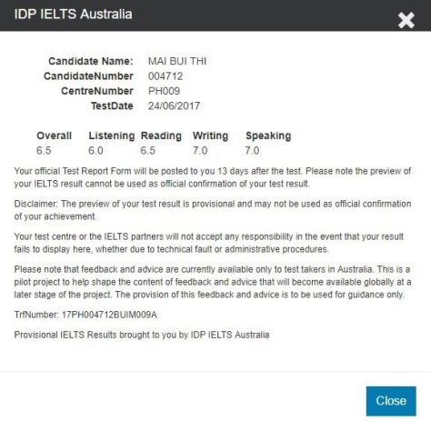 Vừa qua học viên Trường Anh ngữ Philinter Bùi Thị Mai đã đạt kết quả IELTS 6.5 tại kỳ thi IELTS chính thức của IDP Philippines. Với kết quả Writing & Speaking đạt 7.0, đây là 2 kĩ năng được xem là khó nhất của IELTS đồng thời lại càng khó hơn rất nhiều nếu học viên Việt Nam thi tại Philippines.