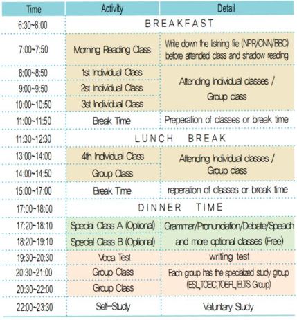 - Riêng khóa Sparta ESL bắt buộc học viên ở ký túc xá Sparta và phải tham gia 2 lớp học buổi tối Remedial Study Time (RST): Lớp học tập trung vào Từ vựng và Thảo luận (1 tiếng rưỡi), phải làm bài kiểm tra mỗi tối thứ Sáu, và giáo viên ở lại phòng học để hỗ trợ mọi lúc.