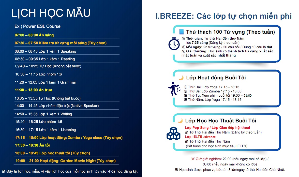 - Số lớp học mỗi ngày: 6 lớp 1:1, 2 lớp 1:4 + Special IELTS Voca 1 giờ