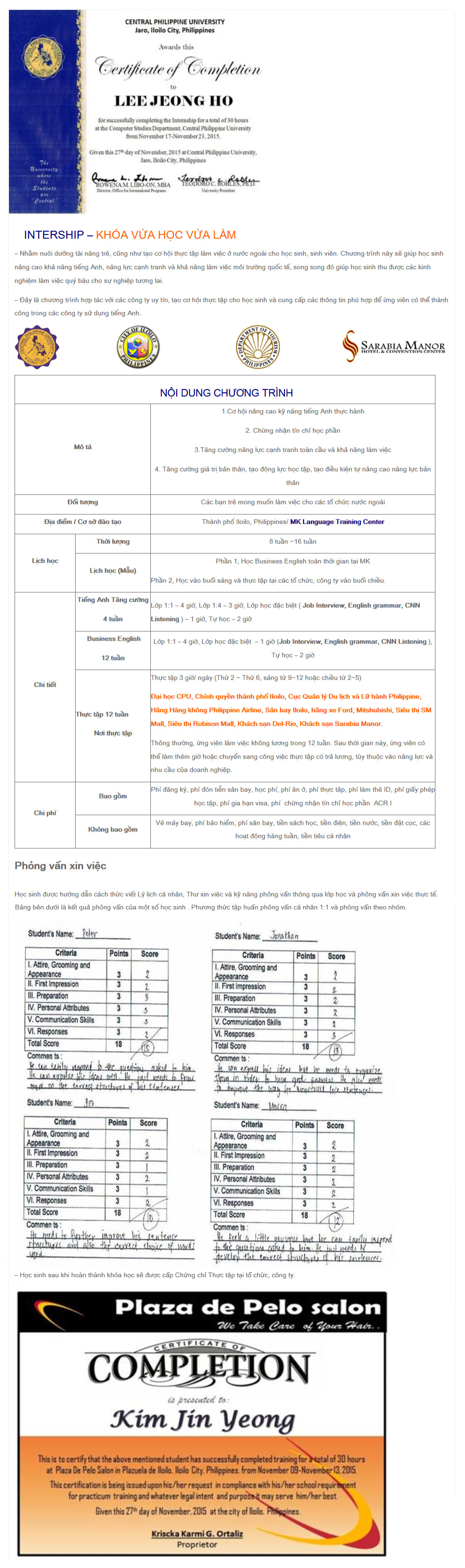 Học viện Anh ngữ MK được thành lập năm 2002 tại thành phố biển Iloilo của Philippines. Trong 10 năm liền, MK đã vinh dự được Chính phủ Hàn Quốc trao tặng các giải thưởng danh giá về giáo dục. MK là trường thực thi mô hình Semi Sparta, đề cao tính kỷ luật, nghiêm khắc trong việc dạy và học, nhằm đảm bảo học viên đạt được kết quả như ý muốn khi du học tiếng Anh tại Philippines. Với mô hình học tập này, học viên không bị gò bó về thời gian nhưng vẫn đảm bảo an toàn và chất lượng kết quả đầu ra.
