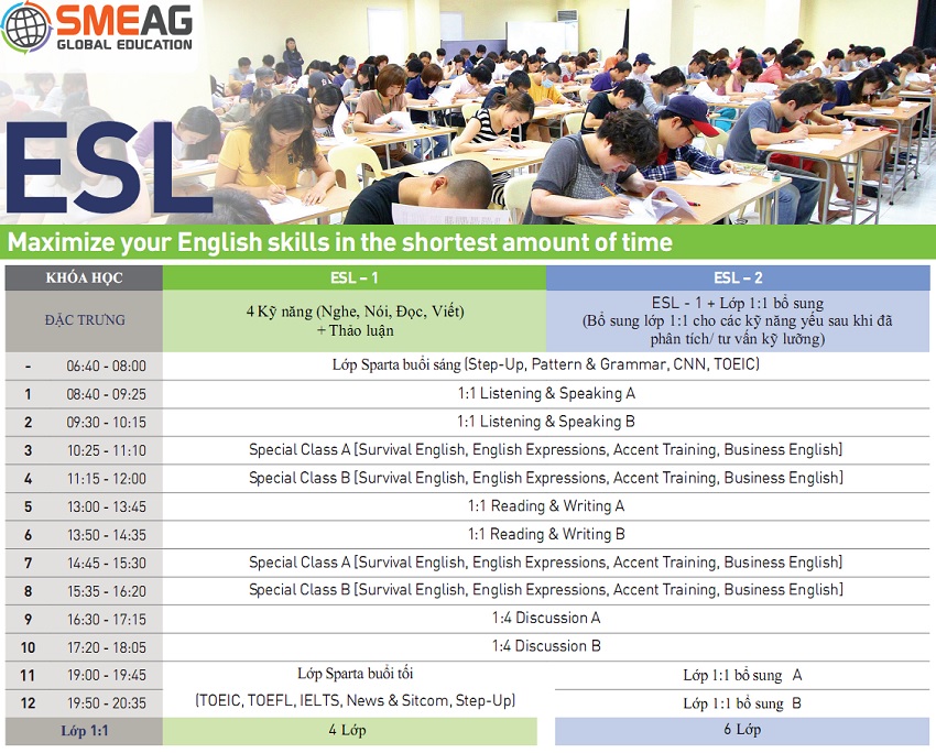 | ESL 1 by Cambridge (CAE) | 10 lớp gồm 4 lớp 1:1 + 2 lớp nhóm 1:4 + 4 lớp tùy chọn |